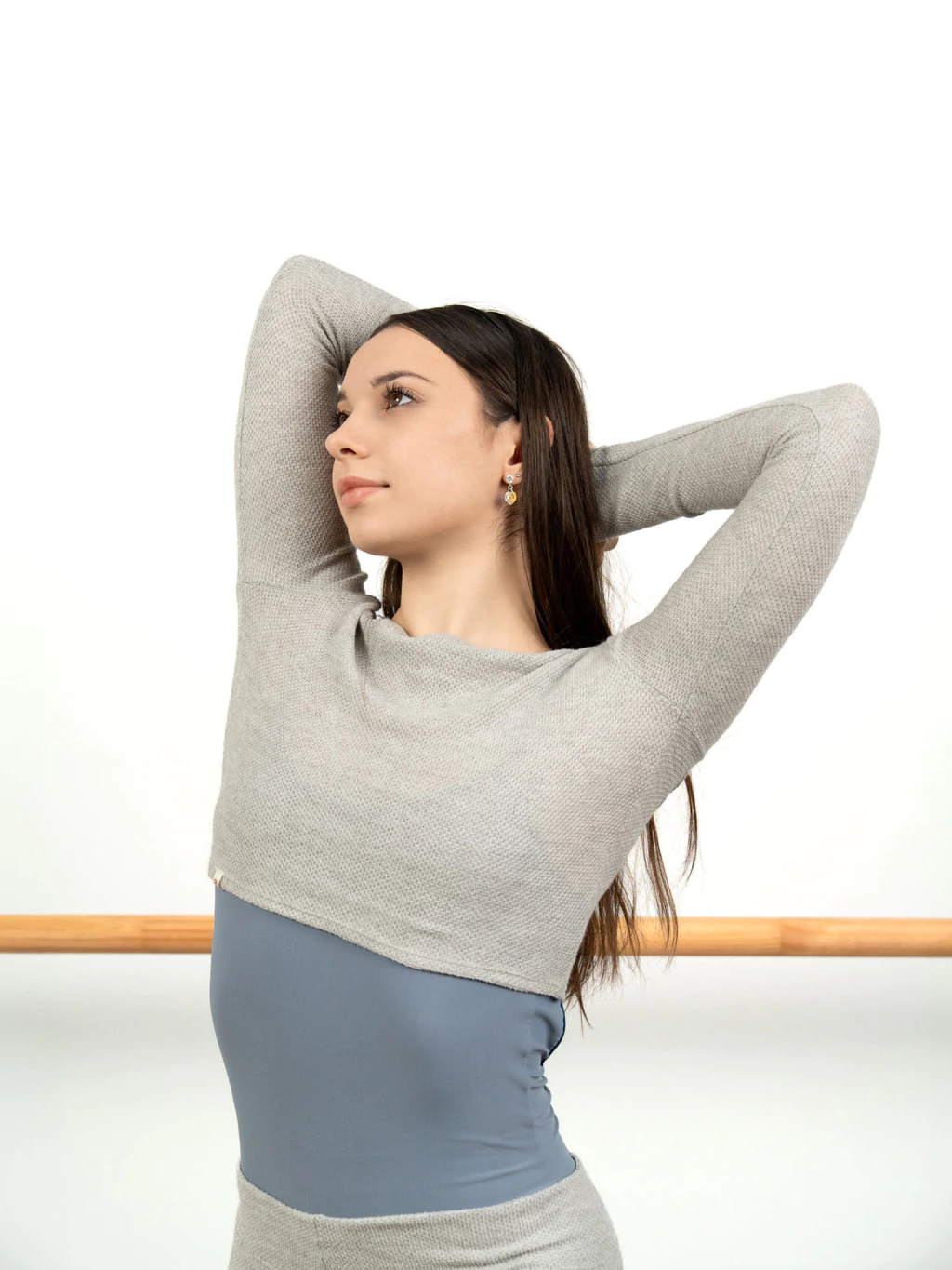 Su diseño crop top, de mangas largas y con cuello bote, estiliza la figura y se adapta fácilmente sobre la malla. Ideal para usar durante el warm-up, entre clases o al terminar tu rutina, cuando el cuerpo todavía necesita conservar el calor.